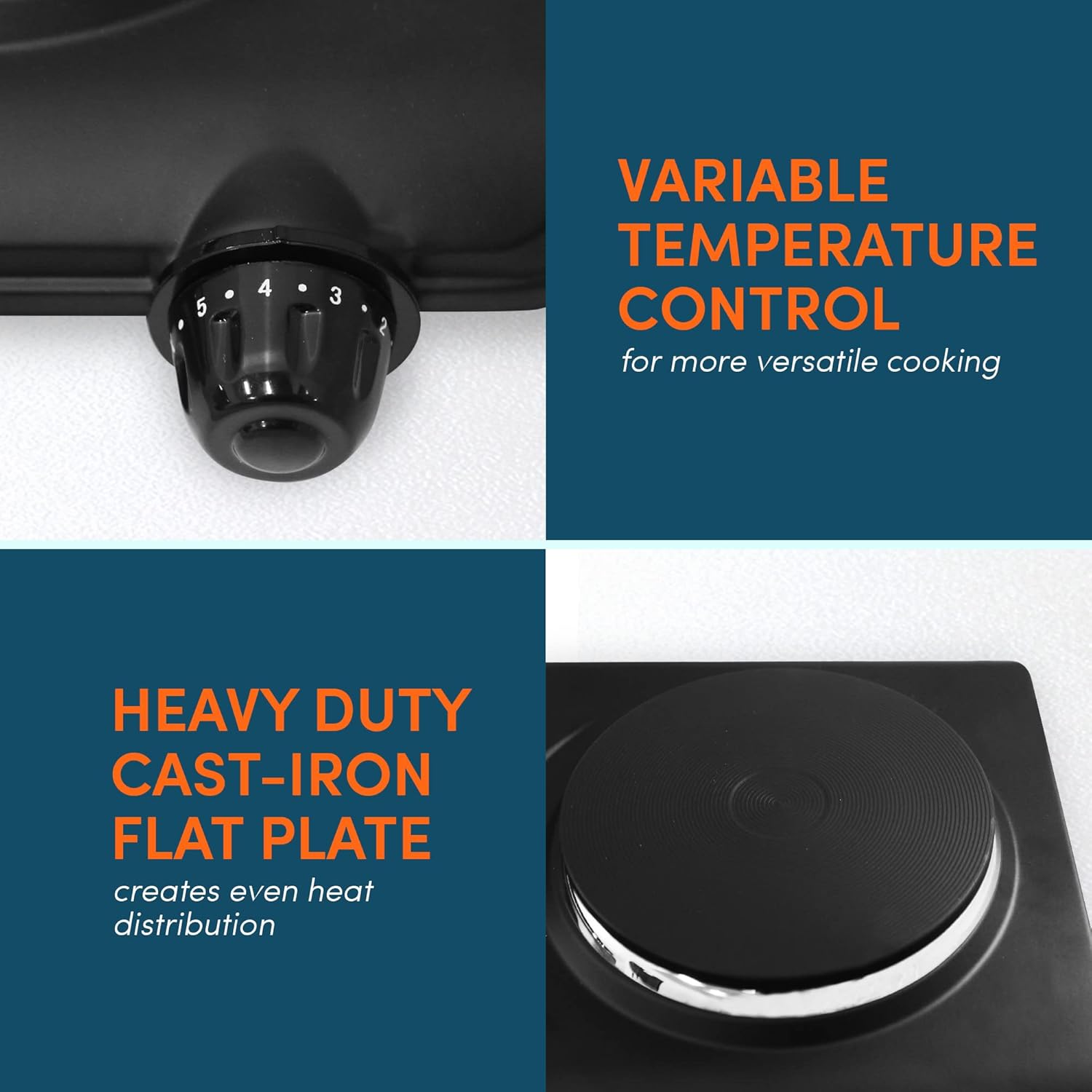 The Elite Gourmet EDB-302BF Countertop Double Cast Iron Burner is the perfect addition to any kitchen. With 1500 watts of power, this electric hot plate heats up quickly and evenly, making it ideal for cooking a variety of dishes.